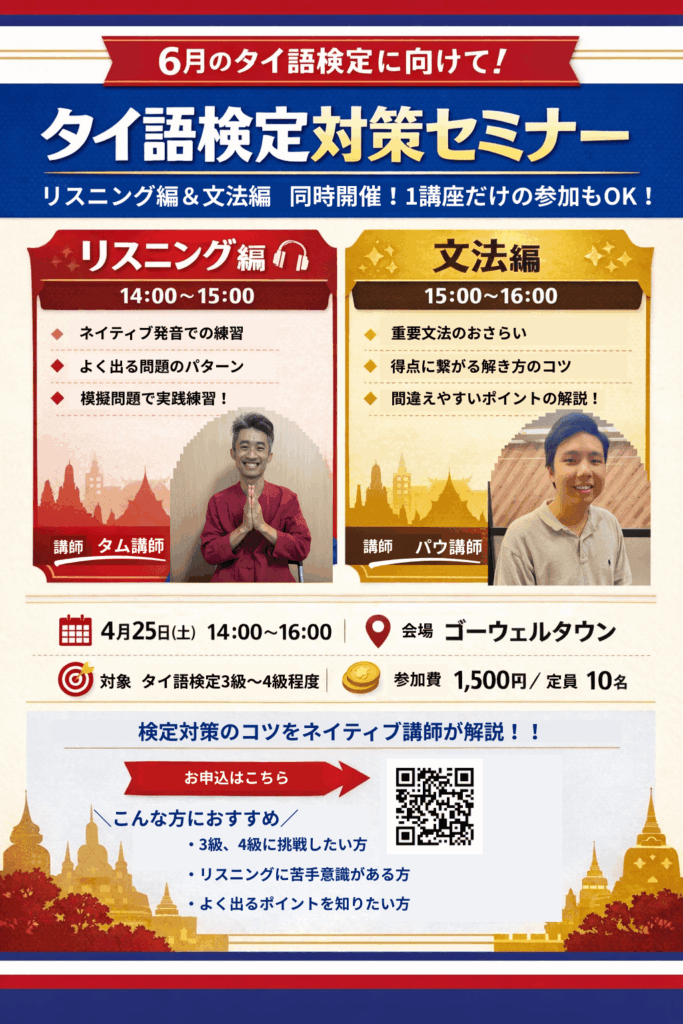 1日でリスニング・文法どちらもカバーできる検定に特化したセミナーです。